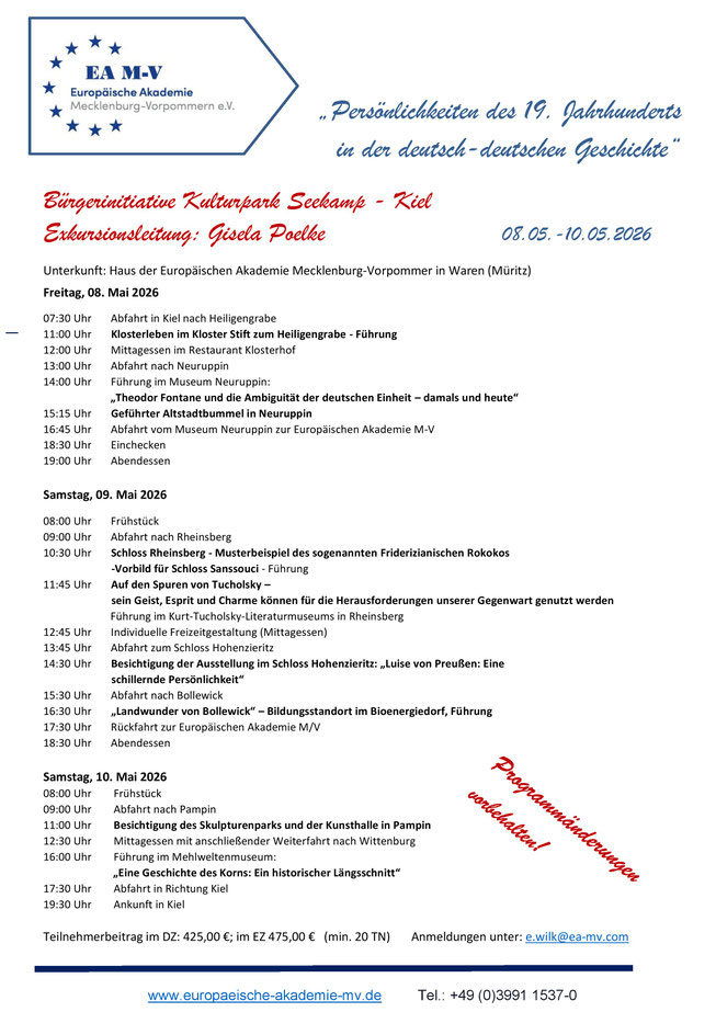 Unsere Exkursion in diesem Jahr nach Mecklenburg-Vorpommern vom 16.–18. Mai 2025 in Zusammenarbeit mit der Europäischen Akademie Mecklenburg-Vorpommern unter dem Titel „Mecklenburg-Vorpommern - literarisch – politisch – geschichtlich“ war sehr erfolgreich und hat viele Eindrücke und vertiefende Erkenntnisse vermittelt. Zu Beginn das Schloss Wiligrad mit seiner Geschichte und nach Restaurierung die zum Beispiel neue Nutzung als Kulturzentrum mit seinem gepflegten Parkgelände am Schweriner See mit einer Führung zu erleben, war eine gute Einstimmung auf die folgenden Tage. So haben wir intensiv erleben können, wie in Mecklenburg-Vorpommern viele Schlösser und Herrenhäuser nach Vorlage eines Nutzungskonzeptes restauriert und so vor dem Verfall gerettet werden konnten.